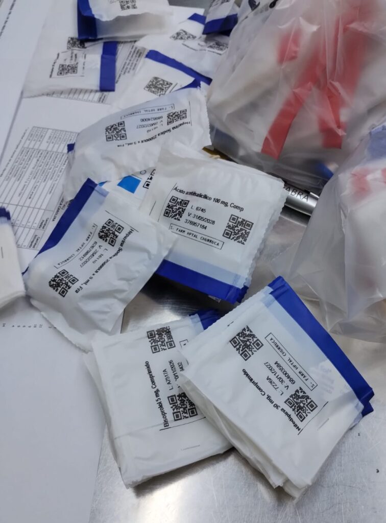En este caso del Hospital Churruca, se utiliza la envasadora de dosis que identifica y embolsa a cada unidad con su referencia e identificación. Además imprime un código Qr para facilitar el uso del armado del pedido desde Farmacia, la recepción en el destino y comprobaciónde tratamiento del paciente (paciente correcto, medicación correcta en el momento adecuado).