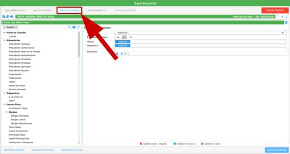 Para poder comenzar con el circuito, primero debemos acceder a la ficha correspondiente. La misma se encuentra en «REGISTRO ÚNICO → Registro Único → Eventos de salud → Nuevo encuentro»