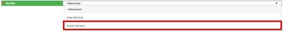Para anular una solicitud, debemos dirigirnos a la misma ficha anterior. Luego seleccionar de la misma manera lo siguiente: