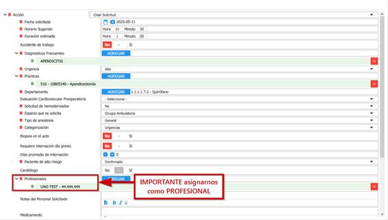 IMPORTANTE: Para que nuestro paciente aparezca en el módulo «Mis Cirugías», debemos asignarnos como PROFESIONAL participante.